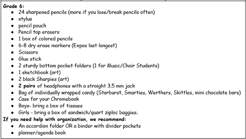 School Supply Lists